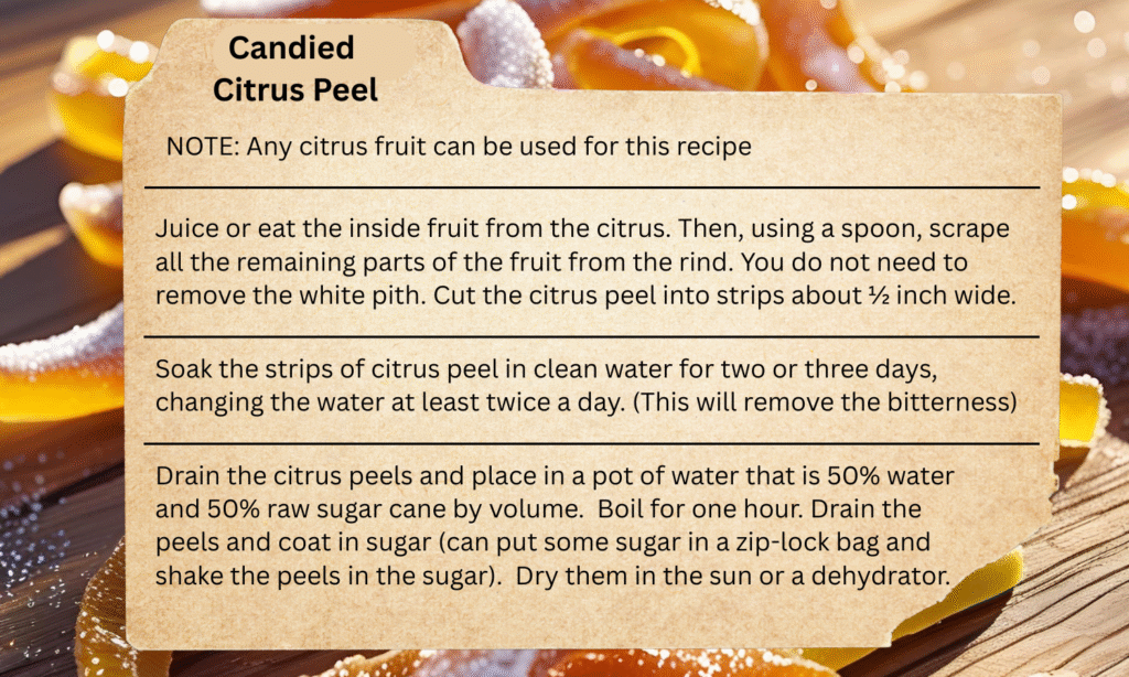 I love how candy was traditionally made from what you had. Candied citrus peel is a great example. I live in Florida; citrus is my resource. I have used citrus peels for pectin, for making citrus peel vinegar tinctures to use for cleaning, but I had never imagined making candy from the peels! The candy is super easy and delicious! I love chopping it up to add to trail mixes, cookies or salads. It is especially good on an arugula salad!