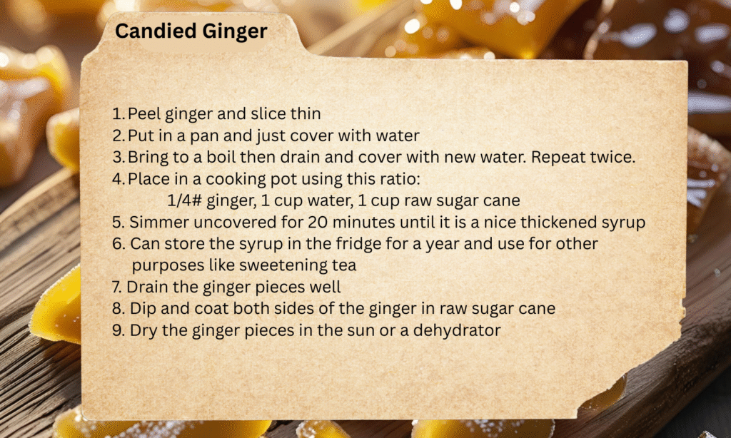 Ginger is easy to grow, and candied ginger is so delicious! Making candied ginger is a little labor intensive though just because it takes time to peel the ginger. Hint: using a spoon to scrap off the peel is the fastest way to peel ginger!
