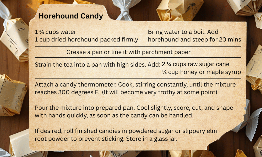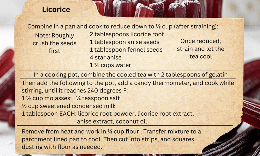 You might have heard of Horehound Candy. Horehound was also used for soothing sore throats. Candied ginger, or ginger candy drops, were used to help with nausea or menstrual cramps. Licorice candy was made with licorice root, anise, and fennel seeds. Licorice is said to help with heartburn, leaky gut, adrenal fatigue, and more.
